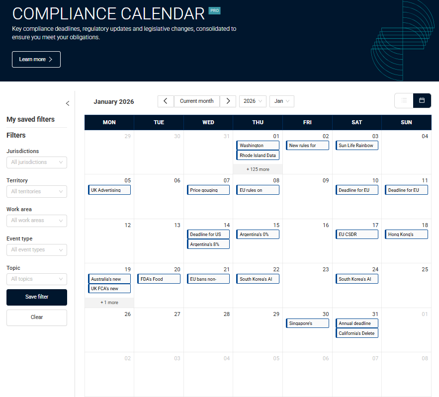 See our new interactive Compliance Calendar for key deadlines and dates in core compliance areas throughout, including enforcement dates, reporting deadlines and changes to regulations.