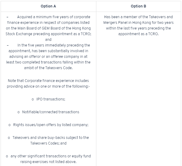 For ROs proposing to advise on Takeovers Codes matters in a sole capacity (“TCRO”), there are two options to satisfy the eligibility requirements:-