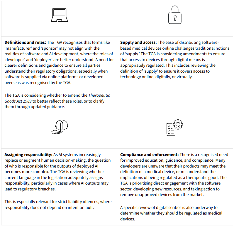 The TGA is re-examining the list of software products that are excluded from therapeutic goods regulation, particularly in light of the increasing use of AI. Exclusions for digital mental health tools, consumer health products, and certain laboratory information management systems are undergoing urgent review due to a concern that these exclusions may no longer be appropriate in light of increasing risk. The TGA is considering whether to remove or amend these exclusions, or to introduce new exemptions with specific conditions.