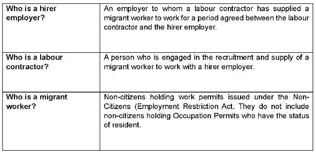 The Act introduces a new legal framework for the employment of “migrant workers” by “labour contractors” who recruit and supply those migrant workers to the “hirer employers” for a specific period of time.