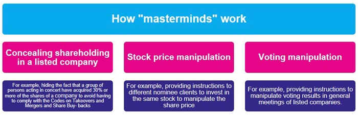 The SFC has also observed that in some instances, nominee clients are taking instructions from “masterminds”. These masterminds are using the nominee arrangement to engage in certain market or corporate misconduct practices.