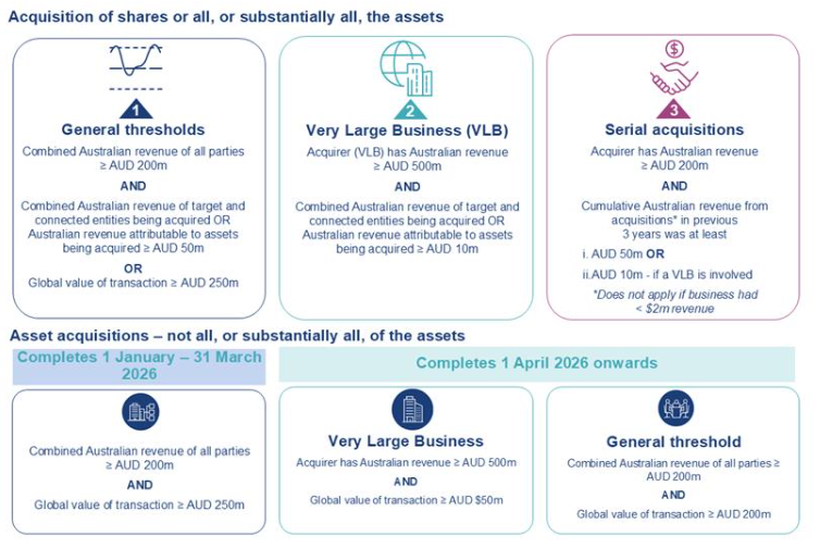 - Changing the monetary thresholds for asset acquisitions that do not involve acquisitions of all or substantially all of the assets of a business (some changes commencing 1 January 2026 and some 1 April 2026)