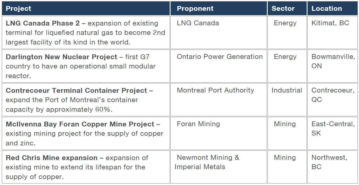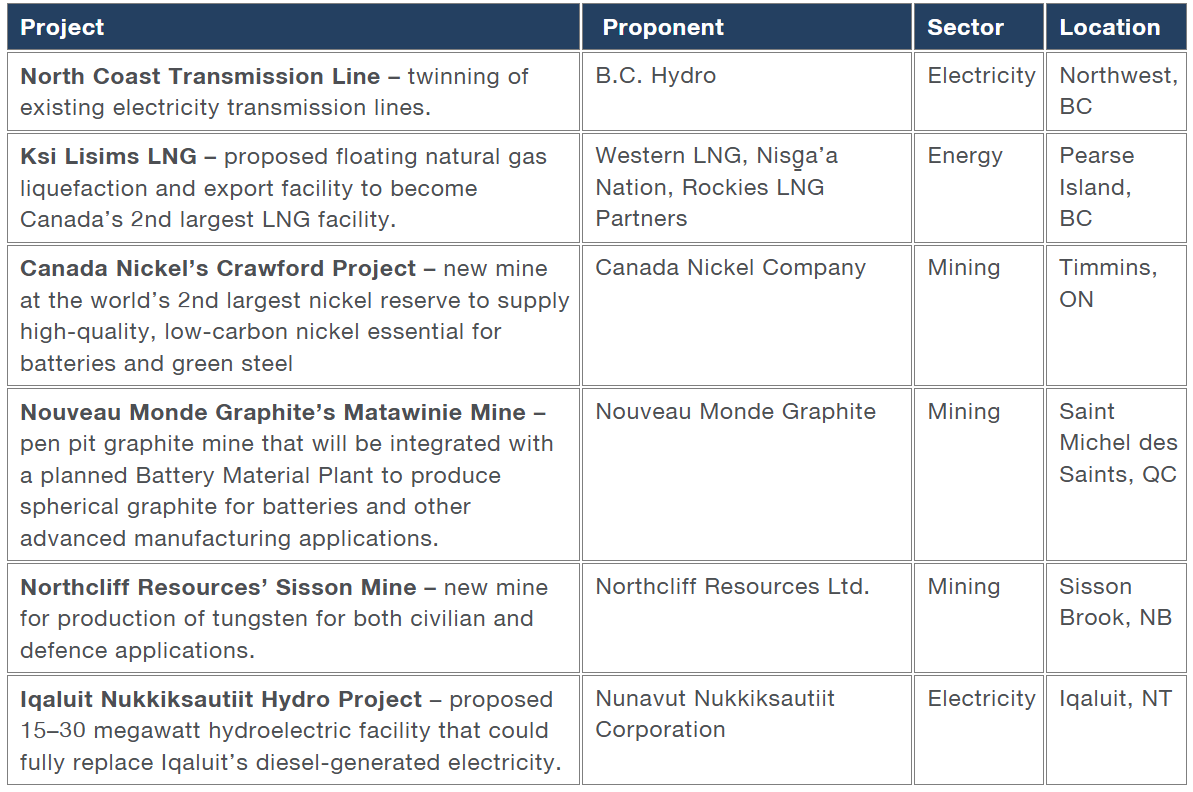 The first tranche of projects announced on September 11, 2025 purportedly represent over $60 billion to the Canadian economy and would create thousands of jobs; these projects are as follows: