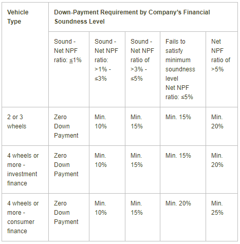 The new down-payment requirements, which are set as percentages of a vehicle’s actual purchase price (i.e., excluding such things as discounts, fees, incentives to third parties, etc.), vary depending on (a) the financial soundness of the finance company and its net non-performing finance (“NPF”) ratio, (b) the number of vehicle wheels, and (c) the type of finance provided (i.e., investment finance or consumer finance), as shown in the following table: