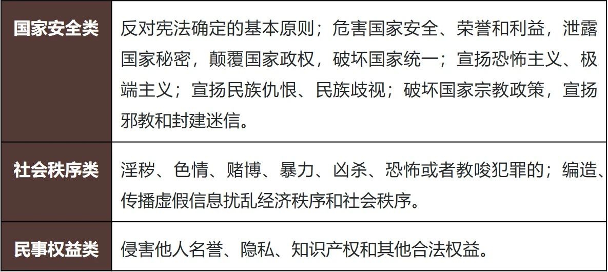 小结来看,根据《网络安全法》及“九不准”相关规定,互联网内容管理所涉及的违法信息主要包括国家安全类、社会秩序类、民事权益类三个方面,其中国家安全类、社会秩序类较为突出和重要,涉及国家政权稳定、民族团结、宗教政策等,以及通俗而言的“黄赌毒”信息。