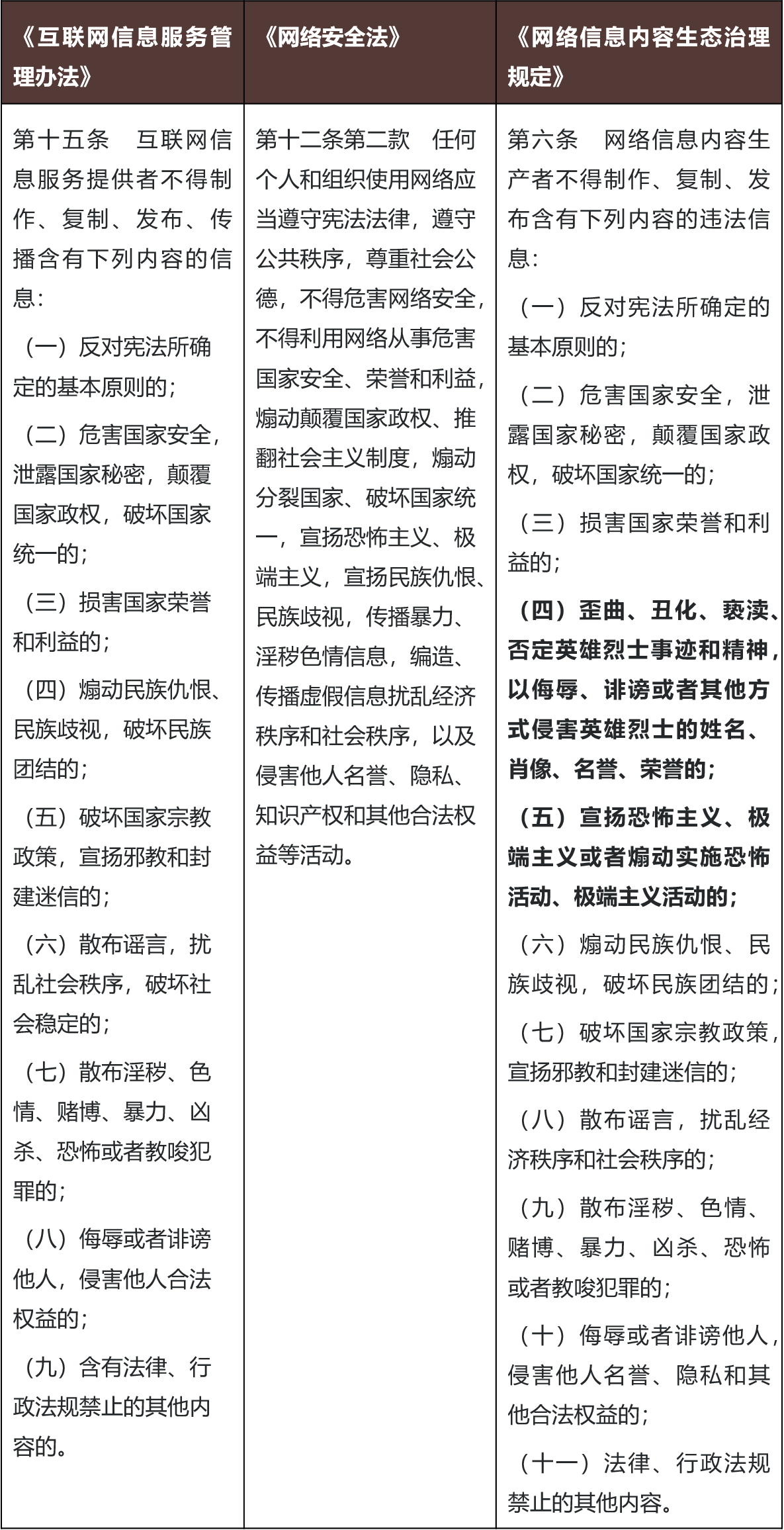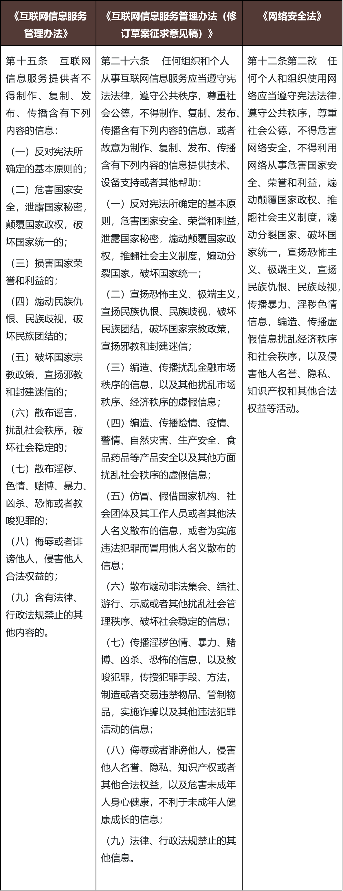 《互联网信息服务管理办法》首次提出了“九不准”的互联网内容管理要求,长期被认为是内容合规的基本法律准则。所谓“九不准”,是《互联网信息服务管理办法》第十五条中规定的九种违法信息类型,《互联网信息服务管理办法(修订草案征求意见稿)》中沿用了这种方式,在第二十六条中规定了九种违法信息类型,而《网络安全法》则在第十二条第二款中概括了“九不准”的主要内容,从更高法律位阶对违法内容进行了确定。