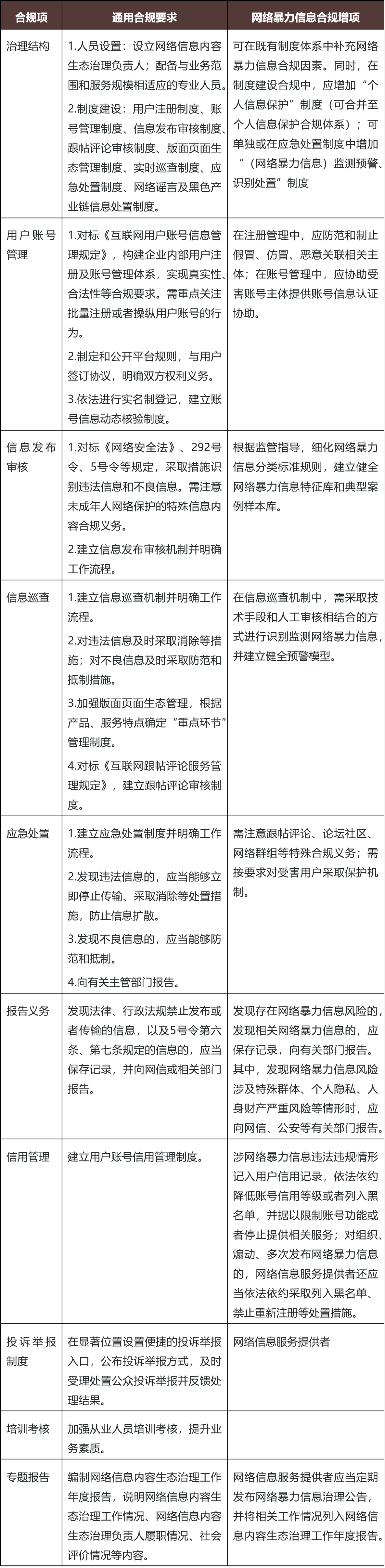 结合上述分析梳理,开展互联网内容合规工作,需搭建基本框架,找准风险点并采取相应措施。为方便指引,我们将5号令和《暴力信息规定》作为合规标准文件,并结合相关其他规定,形成基础合规对照表如下。