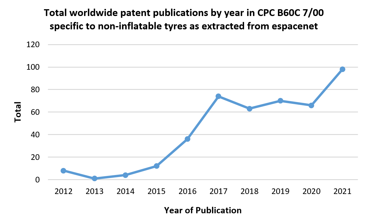 Given the upward trend in patent publications in non-inflatable tyres and the big budgets required to keep ahead of the competition, the well-grounded tyre is set to evolve in years to come.