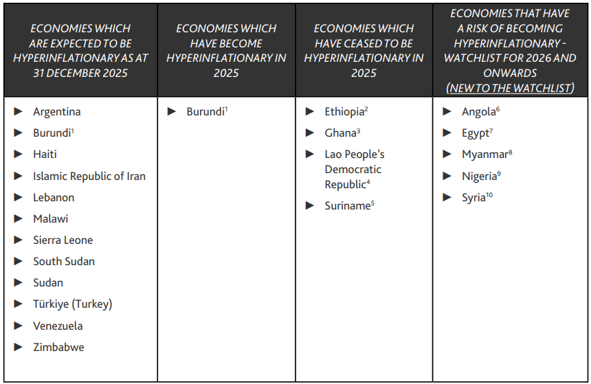 With increasing inflation rates and declining economic conditions around the world, many jurisdictions remain on the watchlist, however, four jurisdictions have ceased to be hyperinflationary in 2025 – Ethiopia, Ghana, Lao People’s Democratic Republic and Suriname