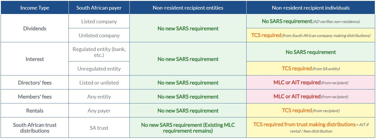 The practical consequence is that foreign holding companies, investment funds, pension schemes, and other non-resident entities receiving dividends, interest, or other income from South African sources are no longer required to satisfy SARS tax compliance requirements before those funds may be remitted. The AD's existing obligation to verify non-resident status remains, but the additional SARS MLC and AIT processes have been removed.