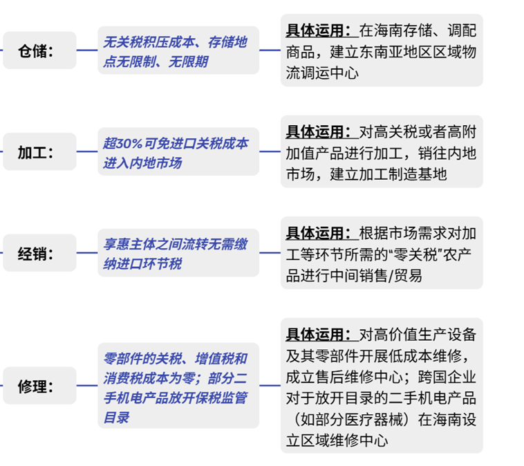 二是为企业提供创新业务模式。例如海南封关后允许38个商品编码的产品在海南自贸港开展保税维修,实现该领域全国最高的开放水平,出海的制造类企业可以结合海南的地理位置,在海南建立面向东南亚或者全球的售后维修中心。